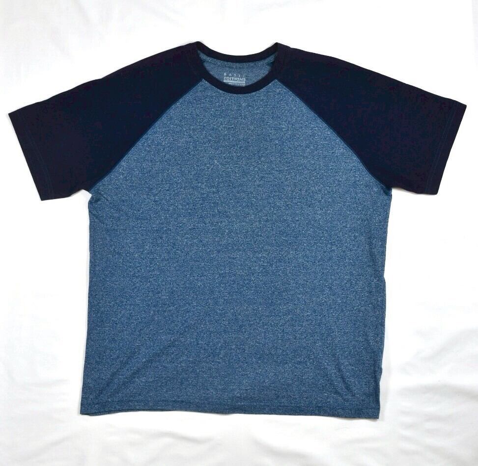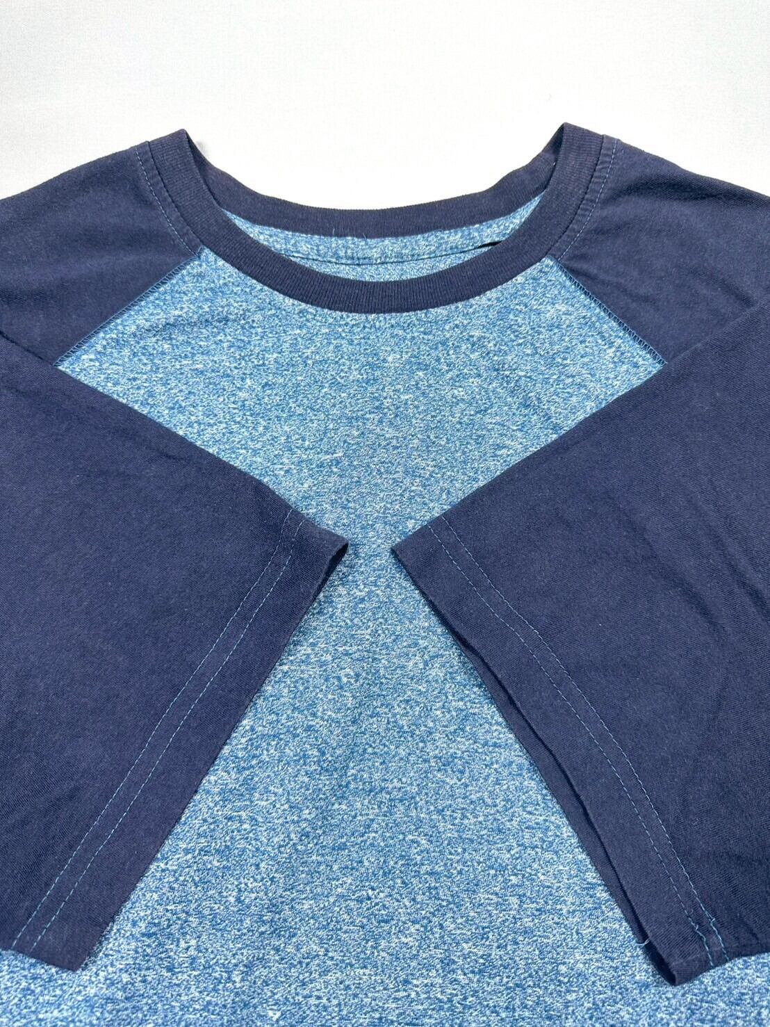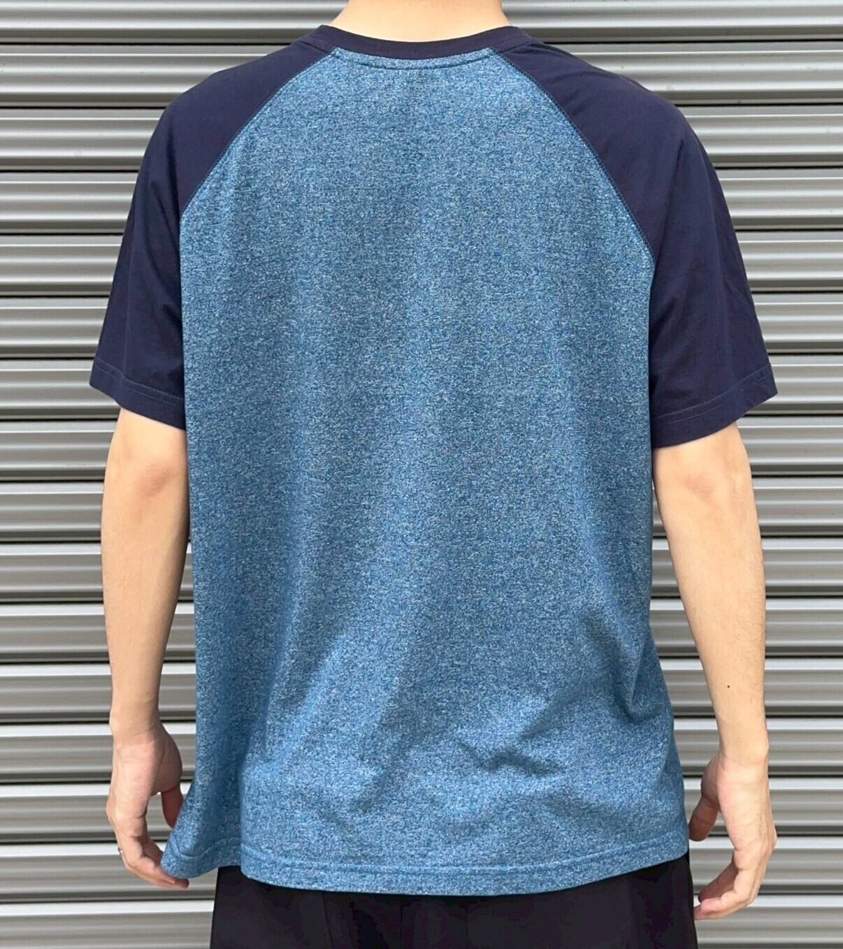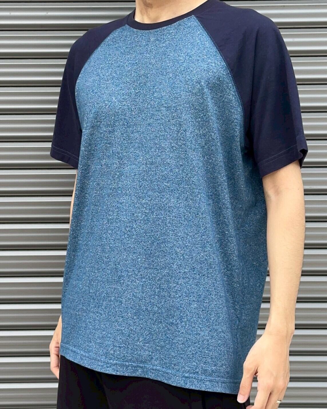 柔らかなヘザーブルーのボディにブラックスリーブを組み合わせたラグランTシャツ